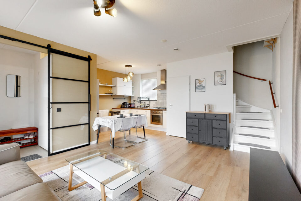 Bij binnenkomst in de woning kom je in de hal met meterkast en toiletruimte. Vanuit hier heb je toegang tot de woonkamer, die zich kenmerkt door de prettige lichtinval en een fijne indeling met voldoende ruimte voor een zit- en eethoek.