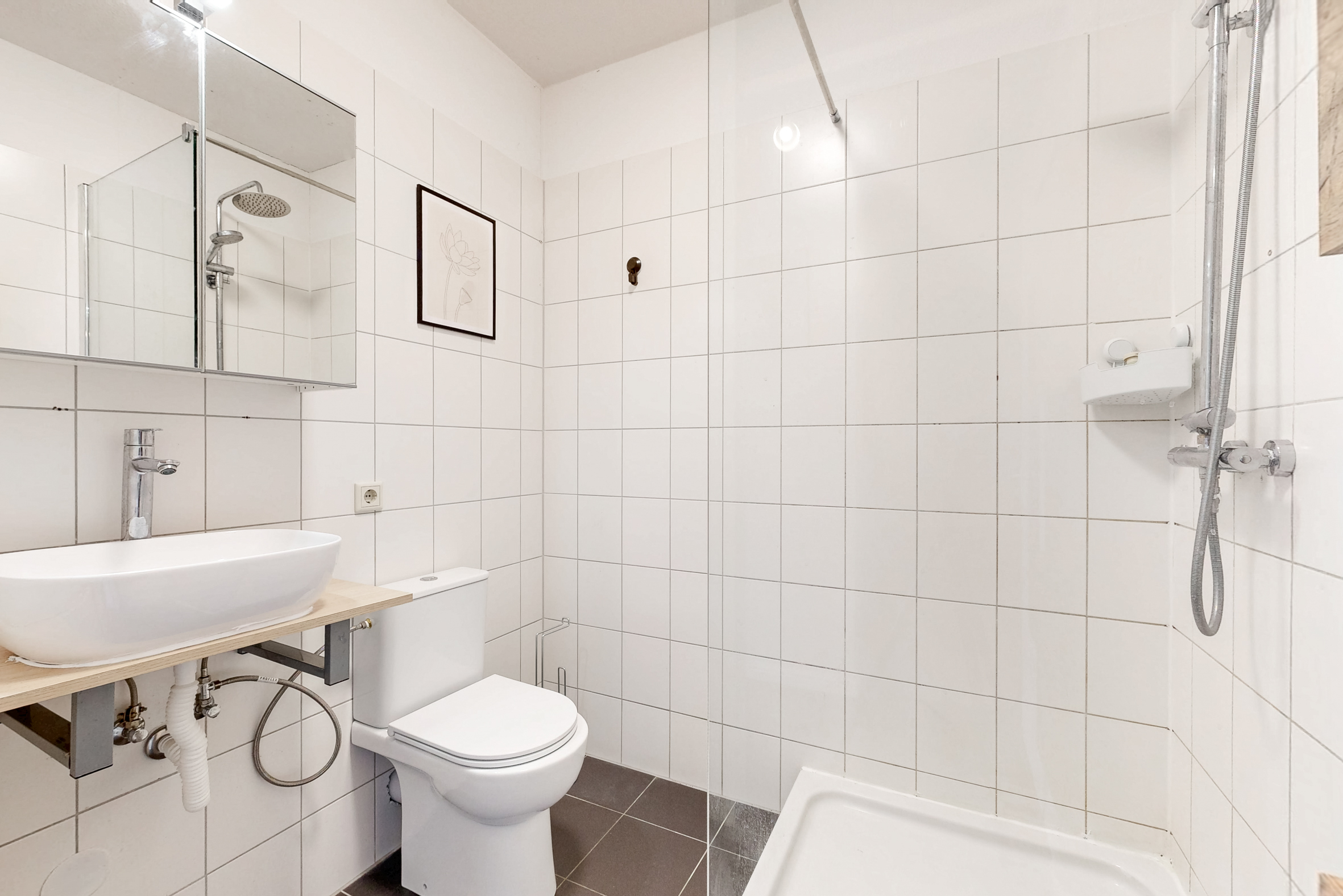 De badkamer is functioneel ingericht en voorzien van een douche, wastafel en toilet. De ruimte is compact maar praktisch opgezet en biedt alles wat nodig is voor dagelijks gebruik.