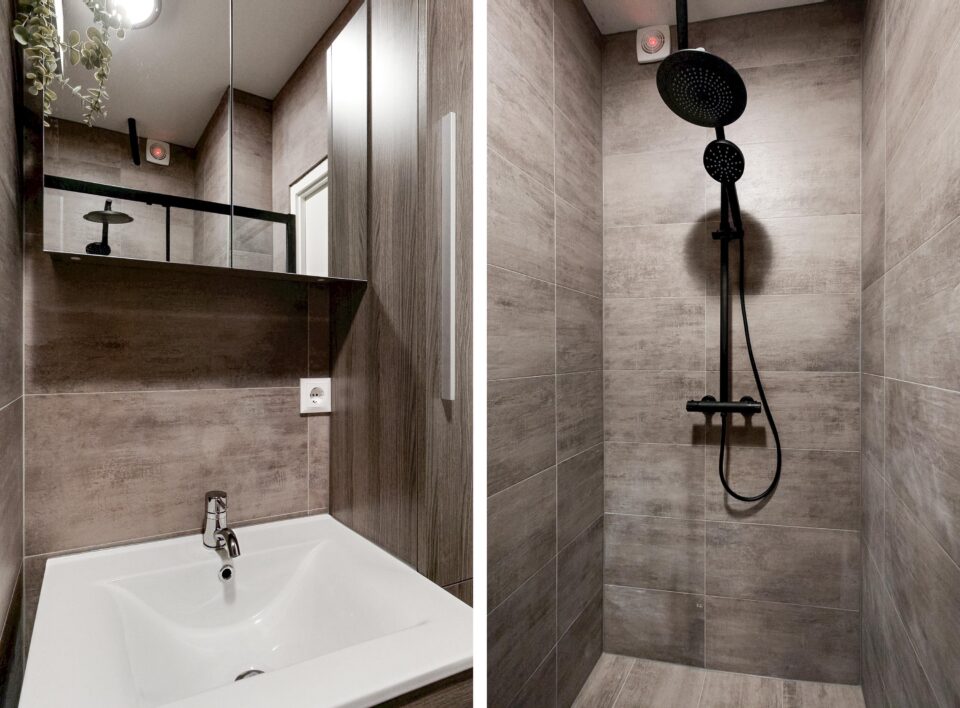 Badkamer met douche en wastafel.