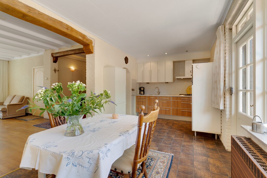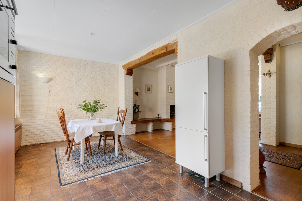 Vanuit de entree is er toegang tot de L-vormige woonkamer (ca. 5.95 * 3.60 + 2.68 * 2.17 m) met parketvloer en open haard. In de aanbouw (ca. 5.77 * 2.80 m) zijn de keuken en eetkamer gelegen De keuken heeft een nette, houten afwerking en is voorzien van de voornaamste apparatuur. Vanuit de keuken is er toegang tot de tuin.