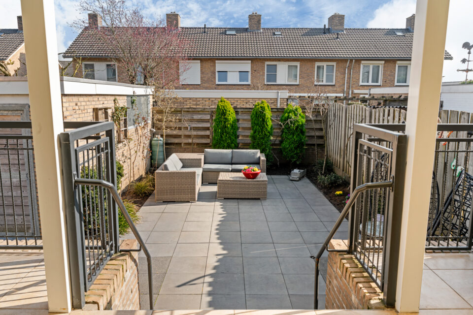 - Goed onderhouden woning met garage, overdekt betegeld terras, verzorgde tuin en balkon;