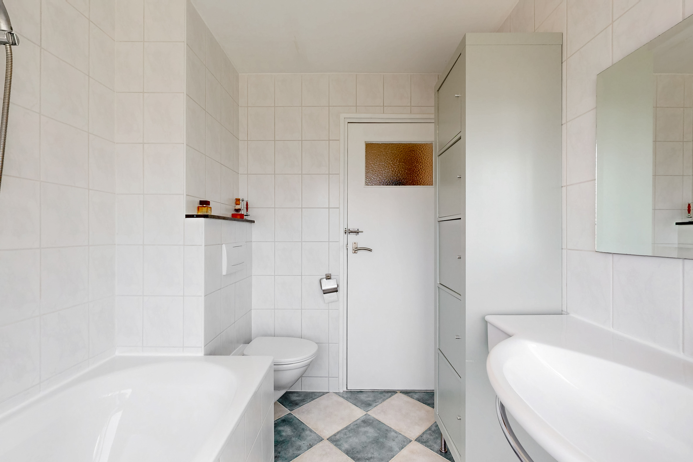 verder bevindt zich op deze verdieping de geheel betegelde nette lichte badkamer met ligbad-/douche cabine, wandcloset en vaste wastafel en is er een handige aparte betegelde wasruimte met de witgoedopstellingen.