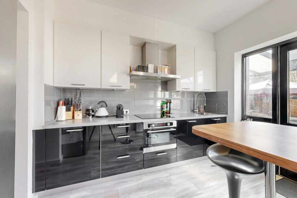 De keuken is voorzien van een nette keukenopstelling voorzien van inbouwapparatuur (koel-/diepvries combinatie, elektrische kookplaat, combi-/magnetron, vaatwasser en afzuigkap).