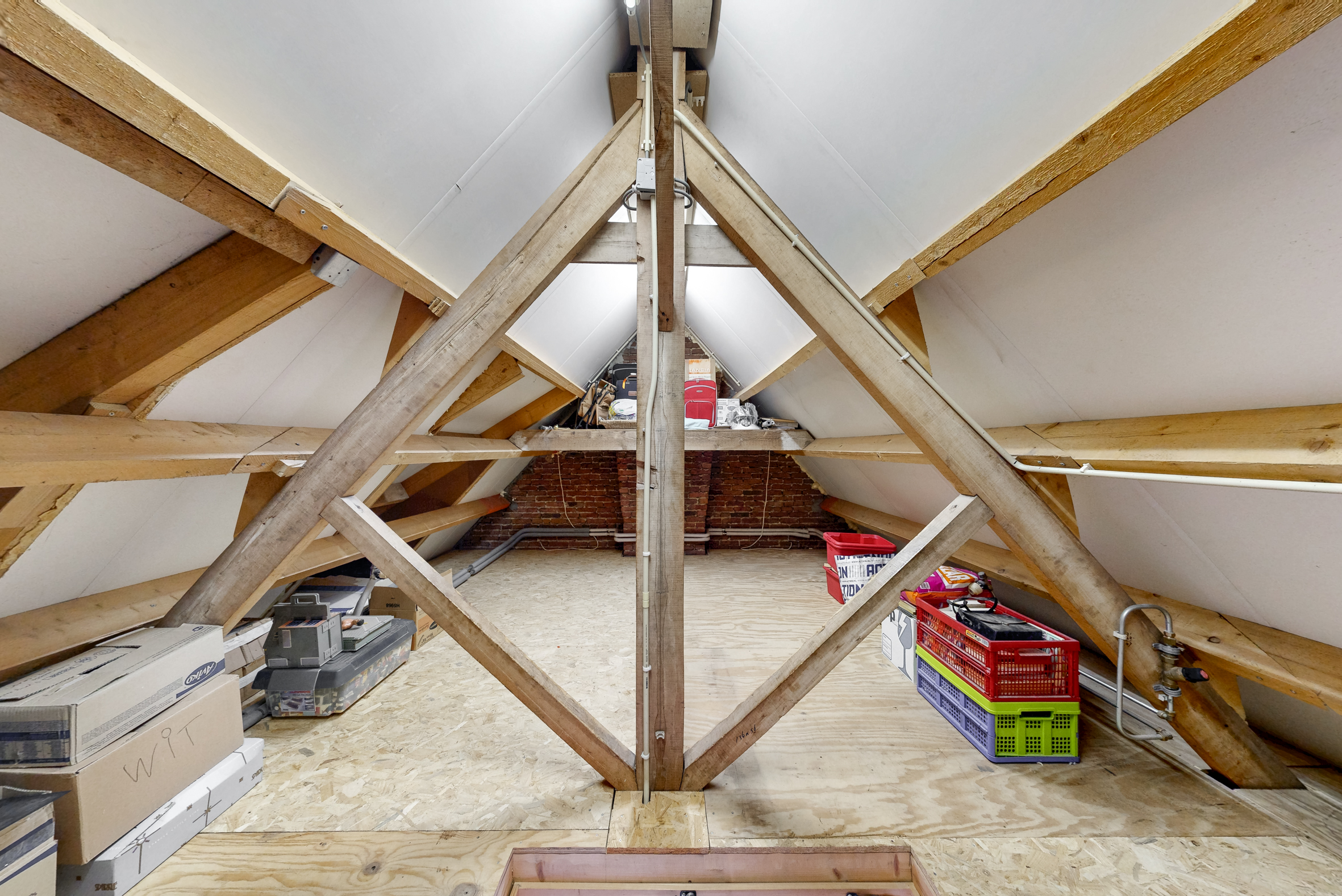 Via vlizotrap naar zolder-/berging met C.V.-opstelling (Nefit, H.R. -combiketel bj. 2022, eigendom).